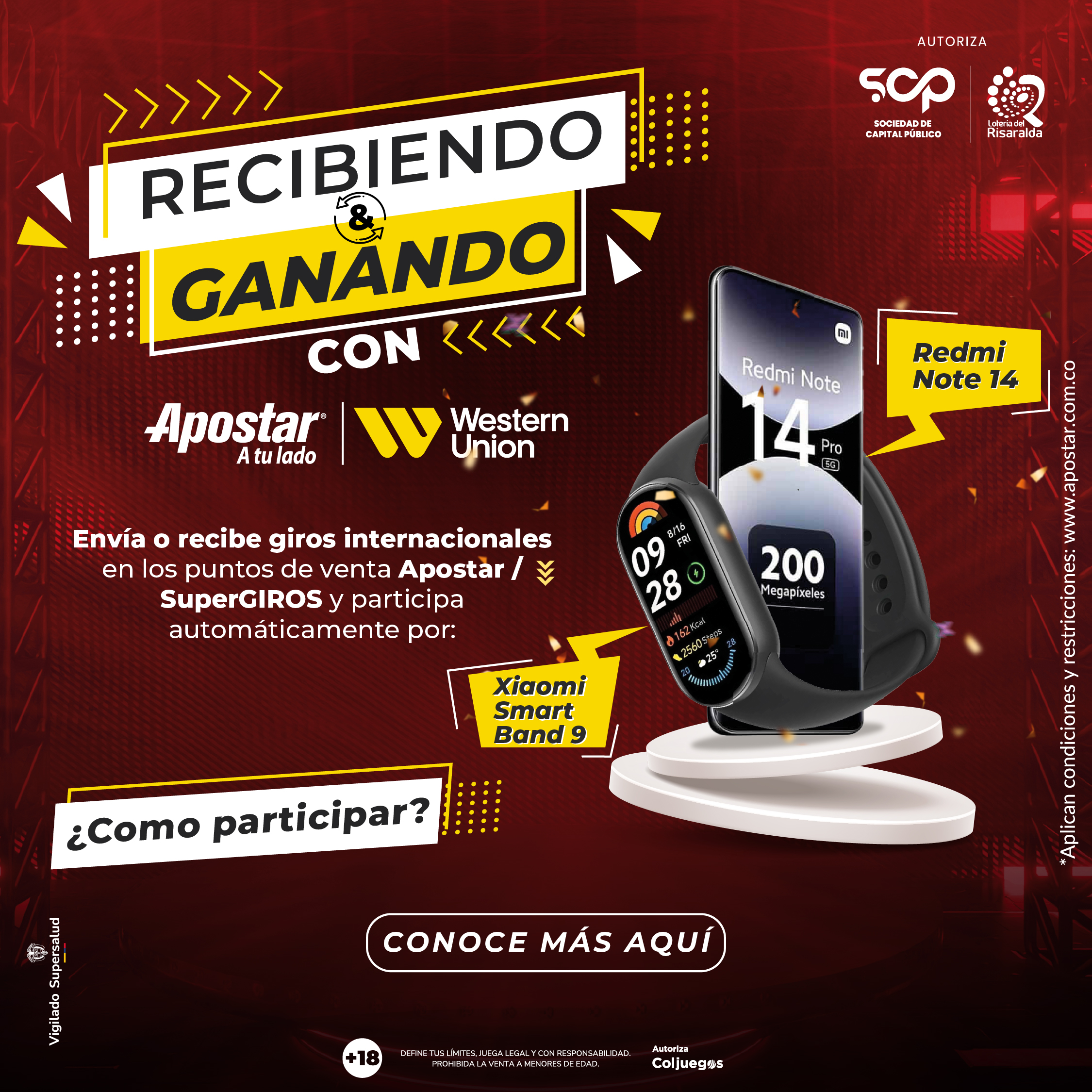 • El premio (celular Xiaomi redmi note 14 + Xiaomi Smart band 9) se entrega únicamente en el estado en el que ha sido adquirido por Apostar S.A.; cualquier trámite de matrícula, SOAT, impuestos, seguros, accesorios adicionales o gastos posteriores serán asumidos en su totalidad por el ganador.